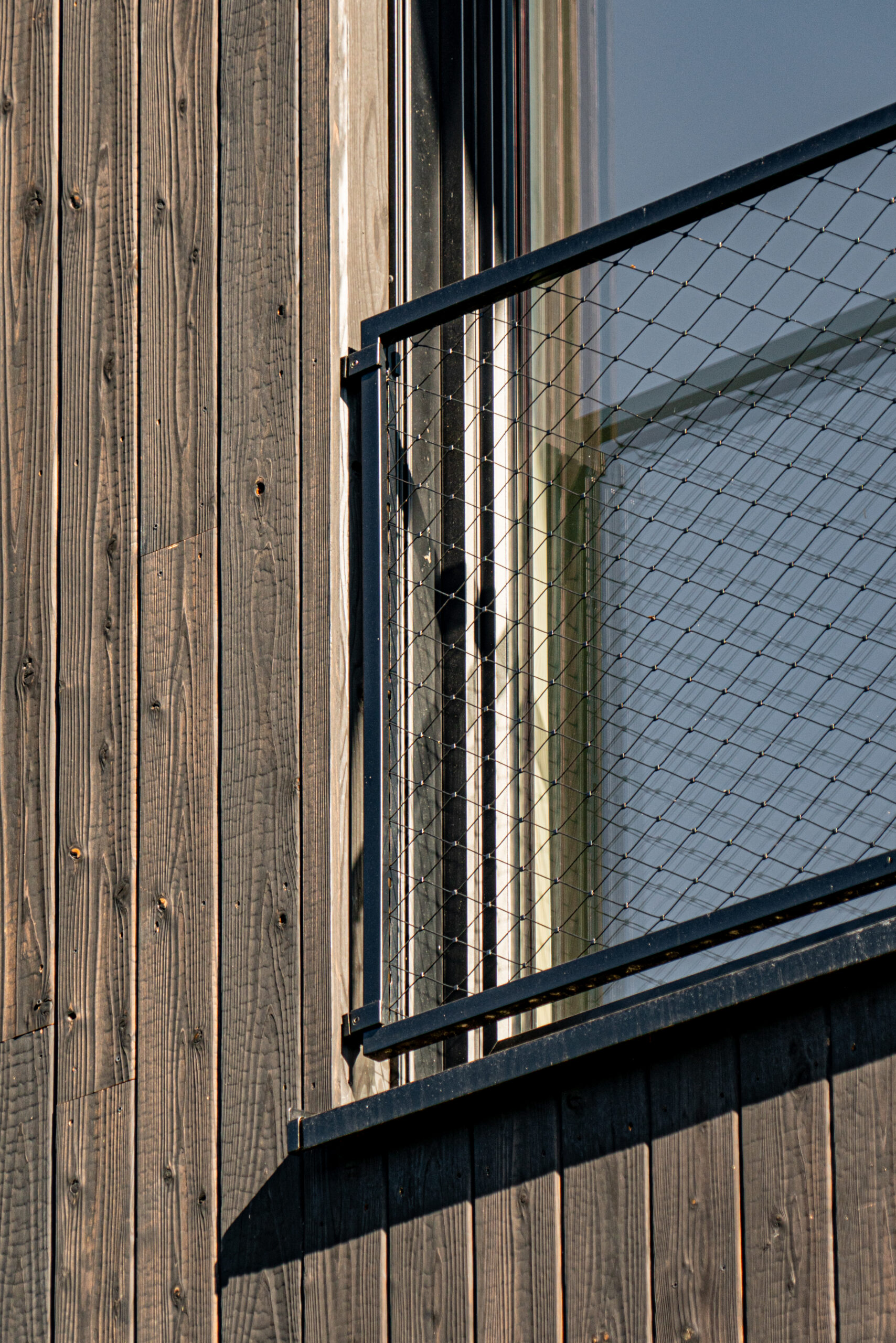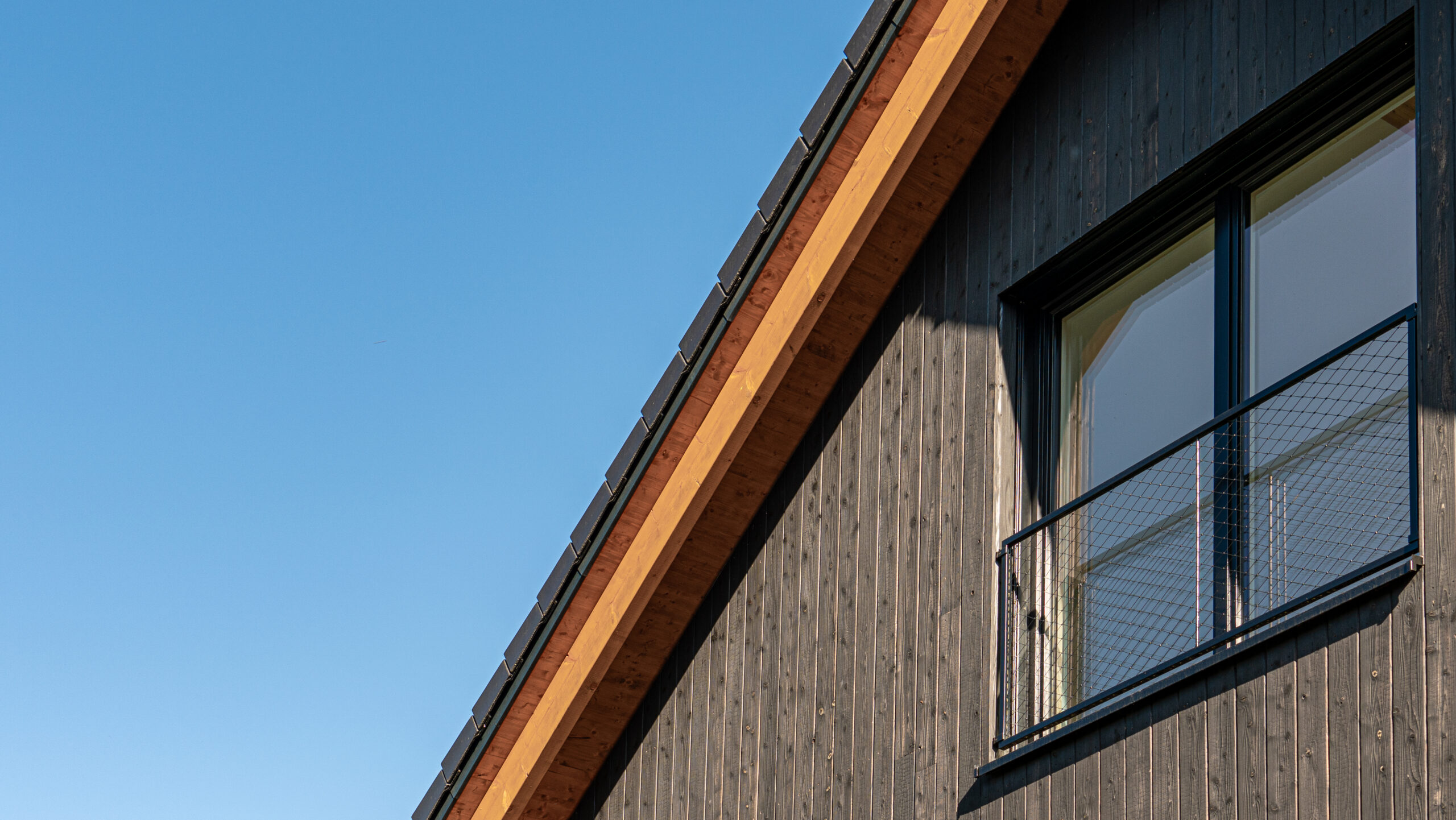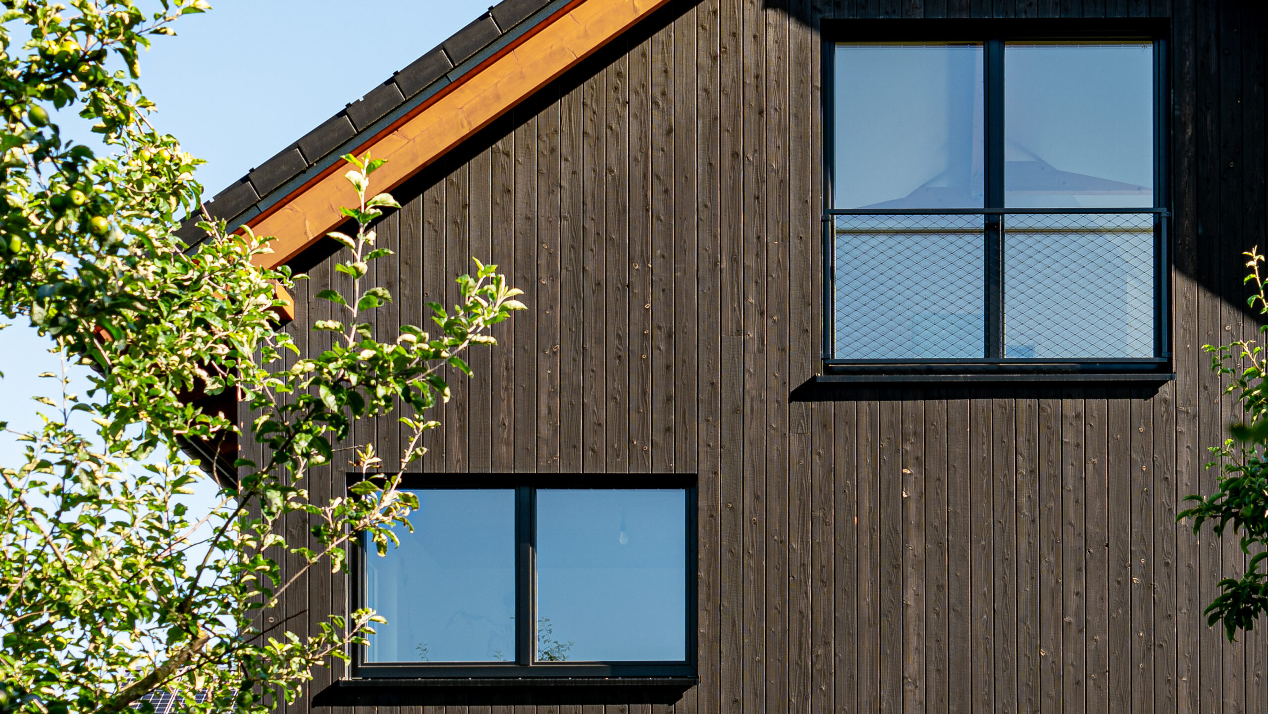 Our Gendai reference project showcases the beauty and versatility of the Yakisugi technique, where wood is charred to enhance its durability and visual appeal. The house features a dark, textured facade that stands in striking contrast to the surrounding light-colored buildings. The deep tones of the charred Gendai wood lend the structure a timeless elegance while complementing its modern design lines.