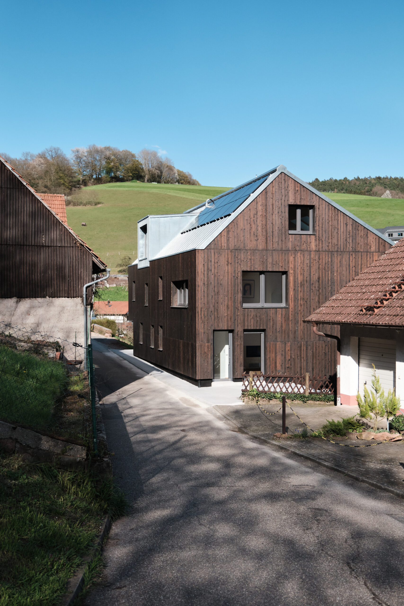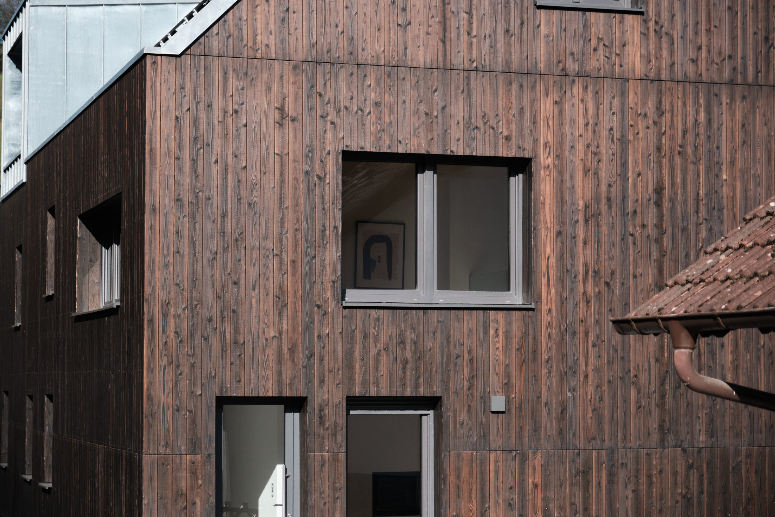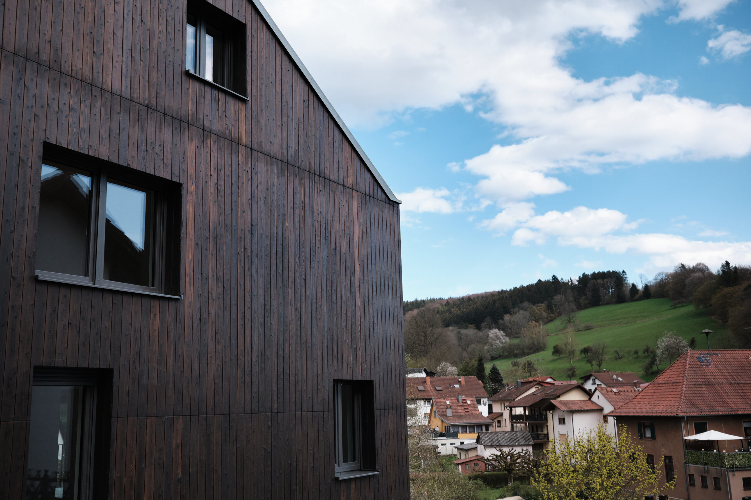 The structure’s facade, adorned with the deep, rich textures of charred Gendai wood, integrates beautifully with the lush, green backdrop of the Odenwald, making it a distinctive landmark. The dark tones of the wood contrast sharply with the light, modern windows and architectural lines, offering a visual dialogue between old and new.
