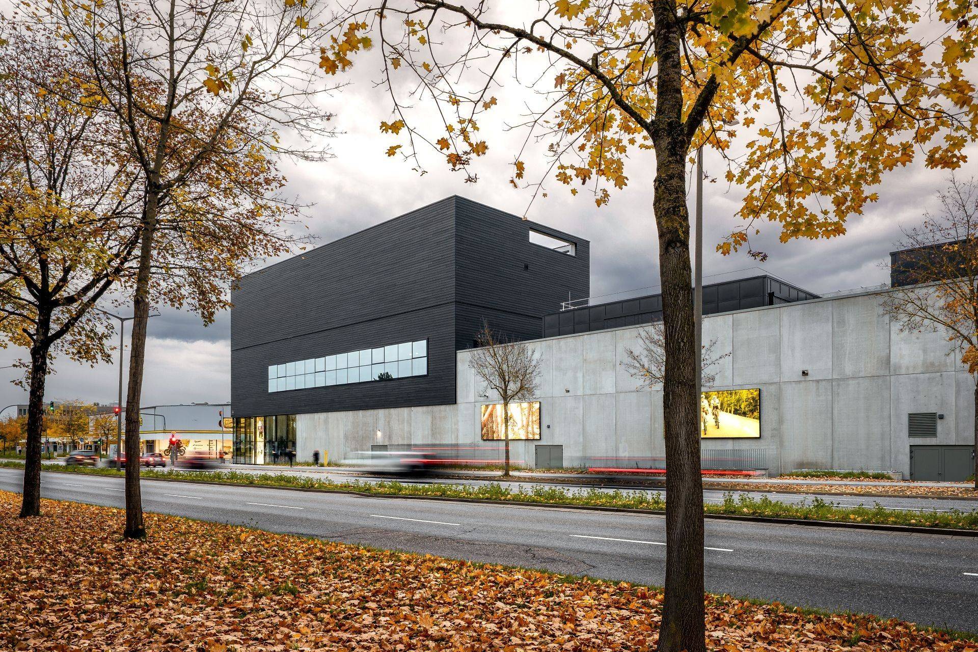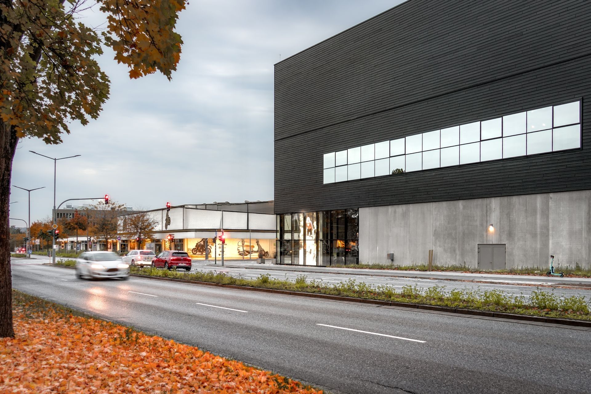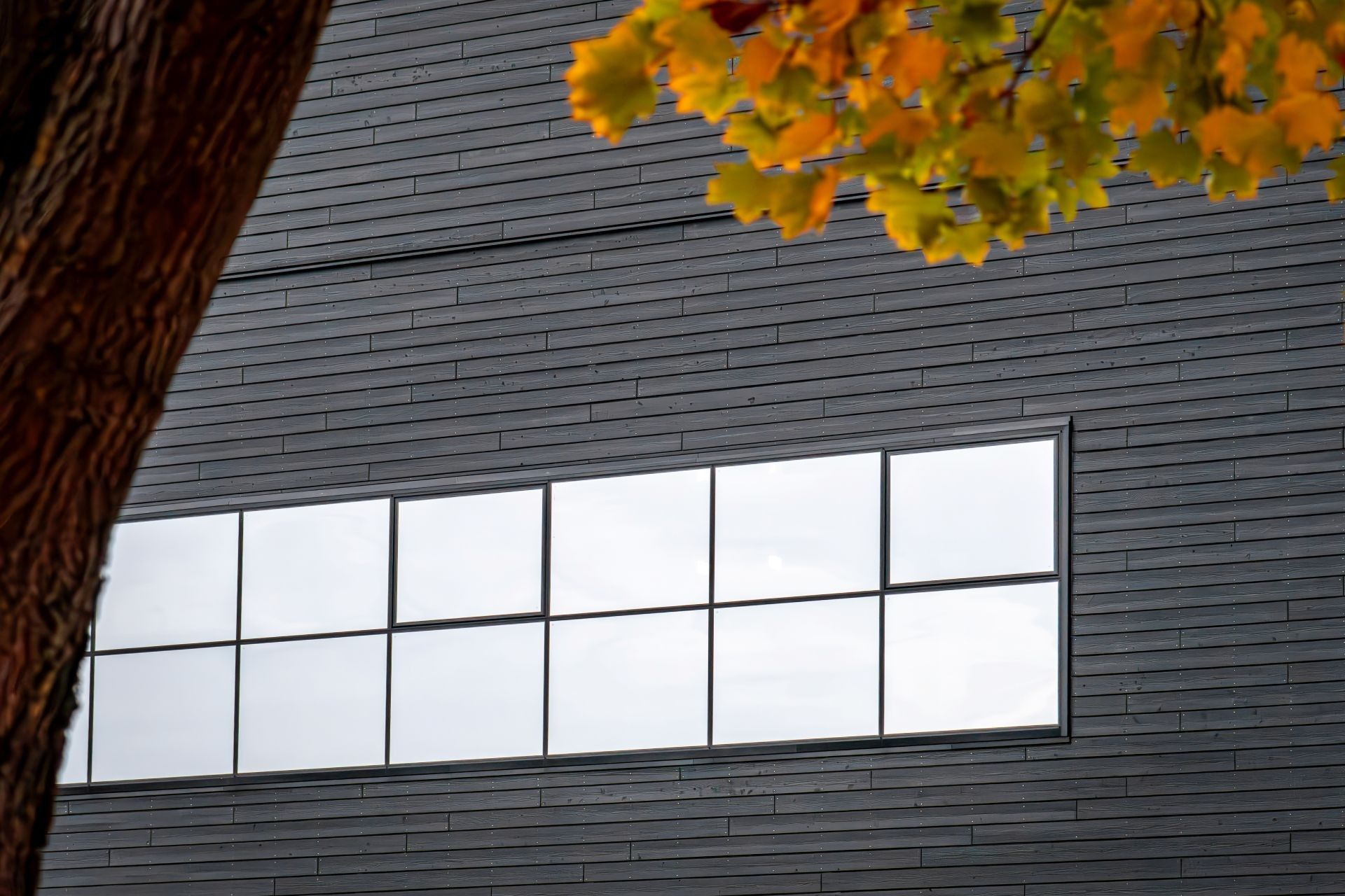 The upper façade is clad with Gendai by Nakamoto Forestry, a refined version of the Japanese Yakisugi or Shou Sugi Ban technique. The deeply textured yet smooth charred wood cladding of Japanese cedar creates a timeless black surface with subtle reflections that shift with natural light. Combined with exposed concrete and large glass openings, it forms a dynamic contrast between tradition and modernity, nature and urban design.