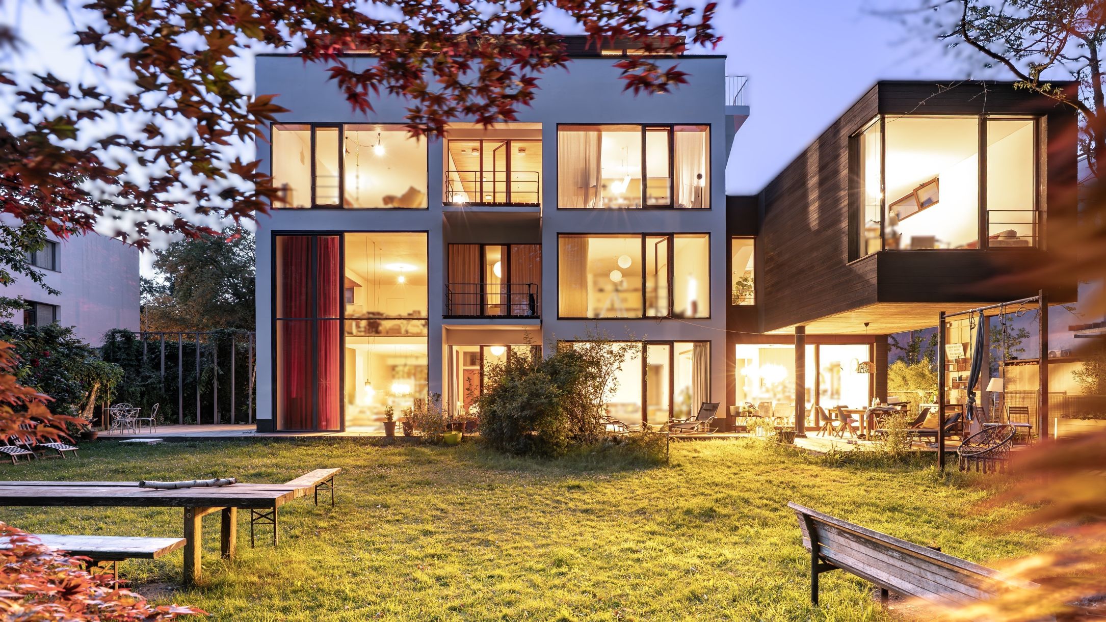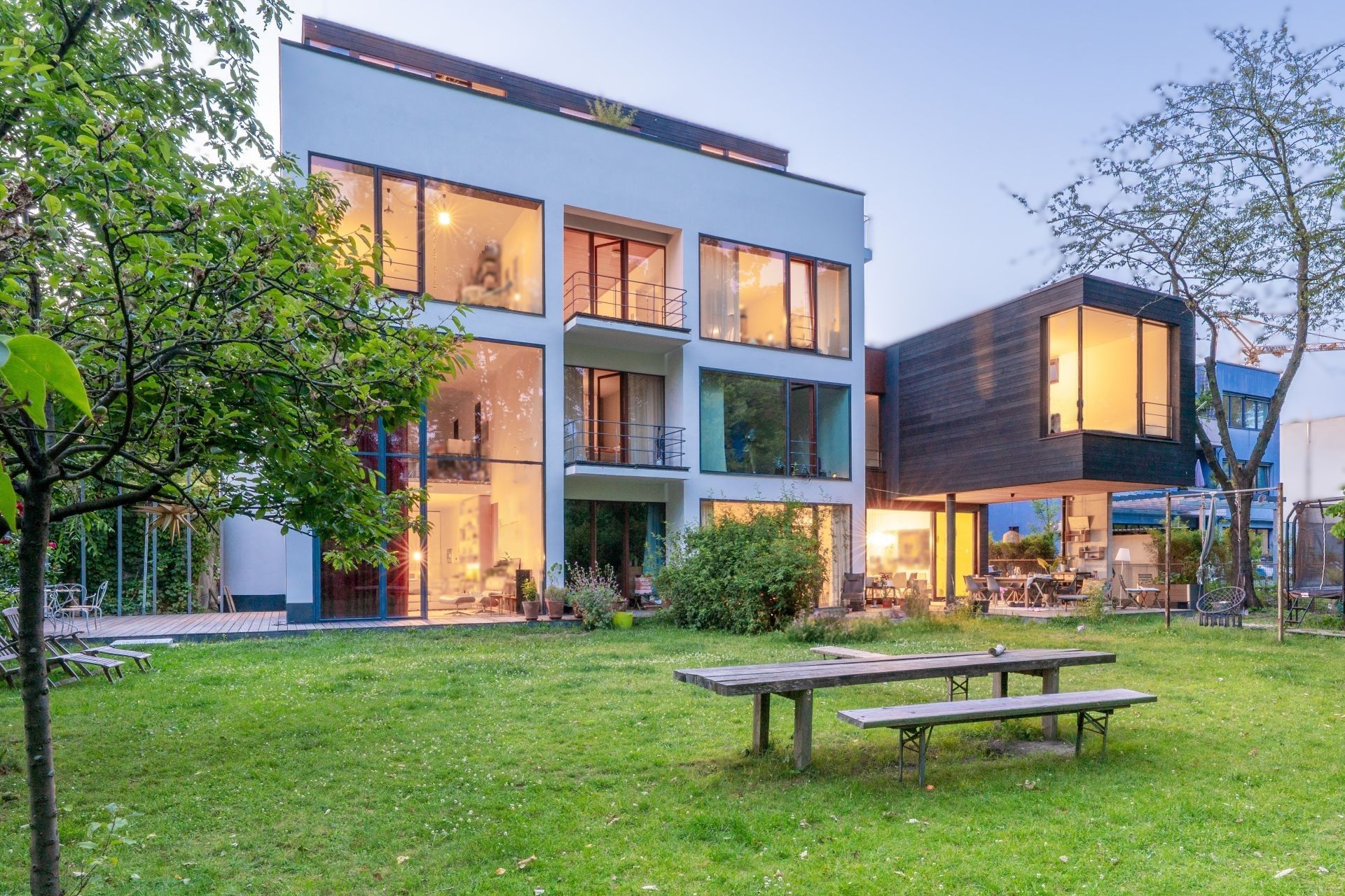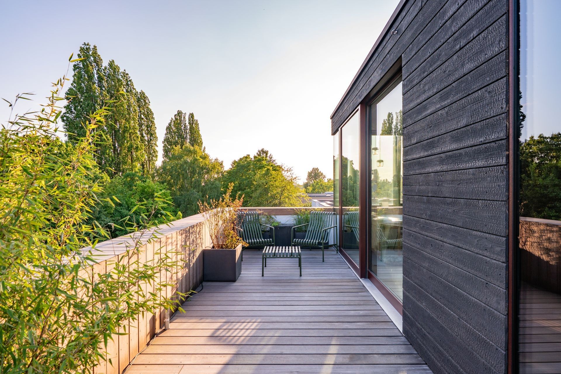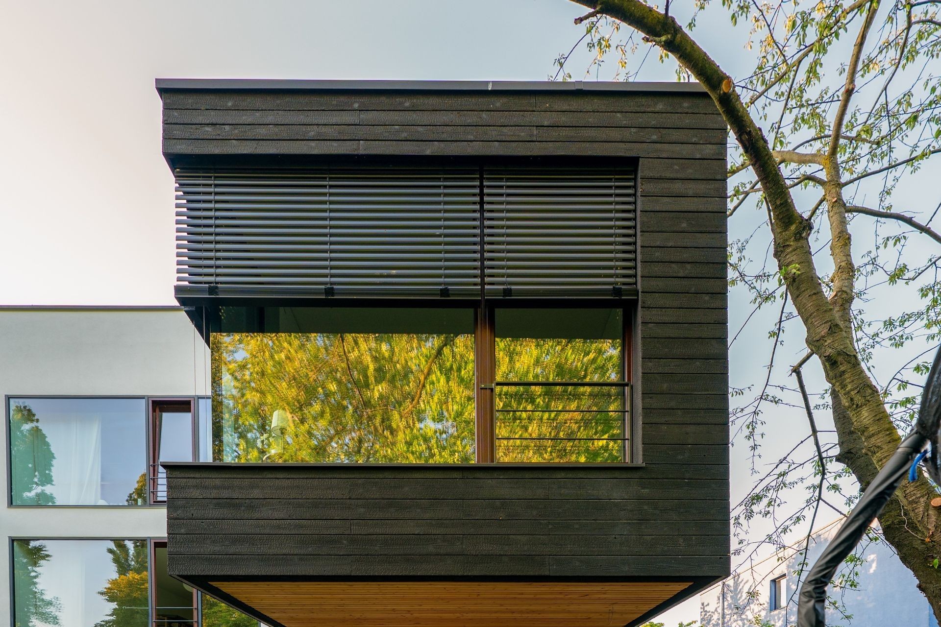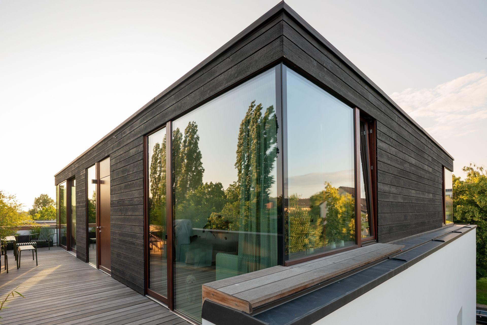 On a verdant plot in Berlin, a former embassy has been transformed into a contemporary live–work house. The existing structure—clean plastered volumes, large openings, a calm grid—sets the stage for a new cubic addition clad entirely in Nakamoto Forestry Suyaki. The deeply charred yakisugi forms a precise, almost floating accent: a black, tactile skin that absorbs light, reveals the wood’s grain, and lends new depth to the ensemble.